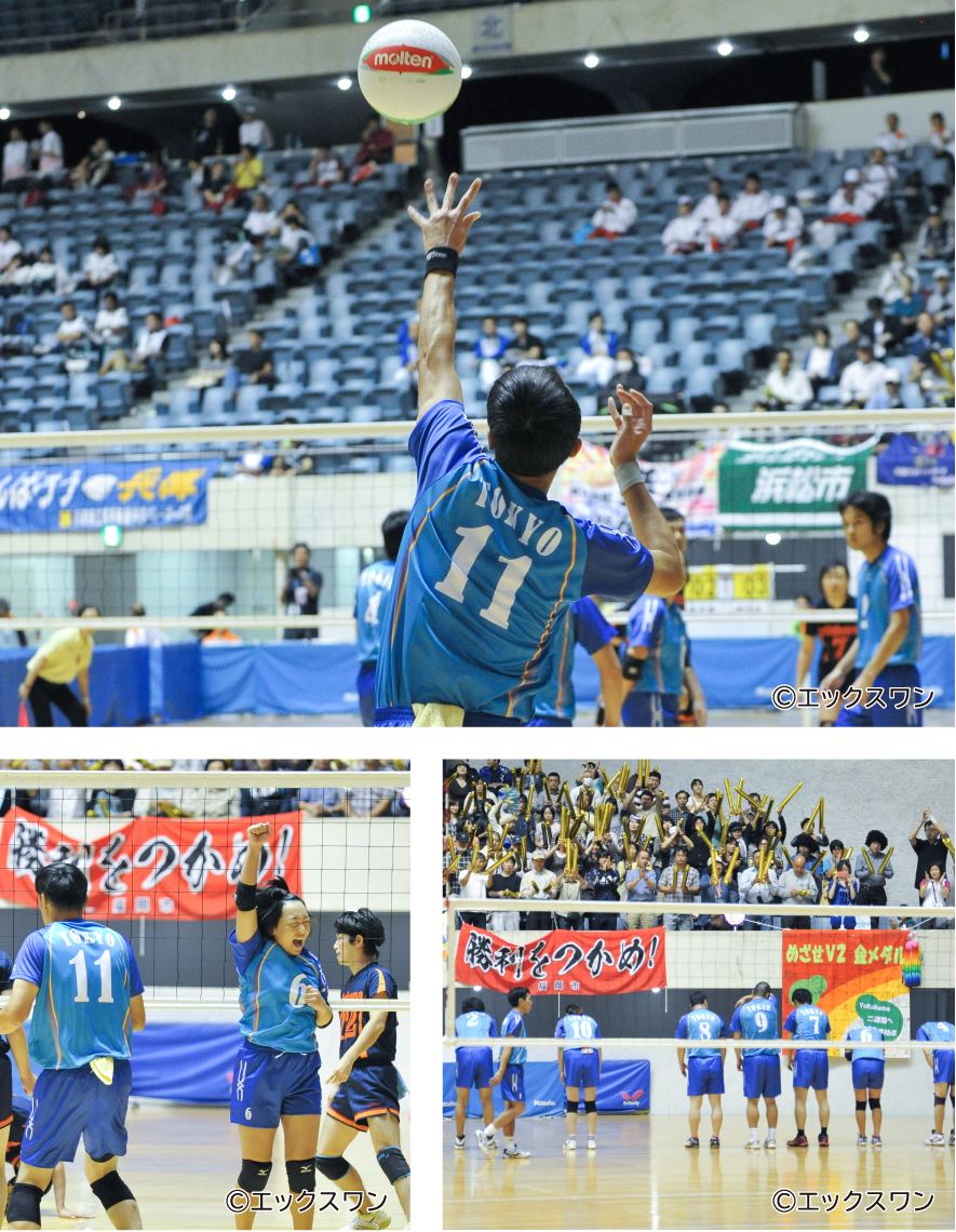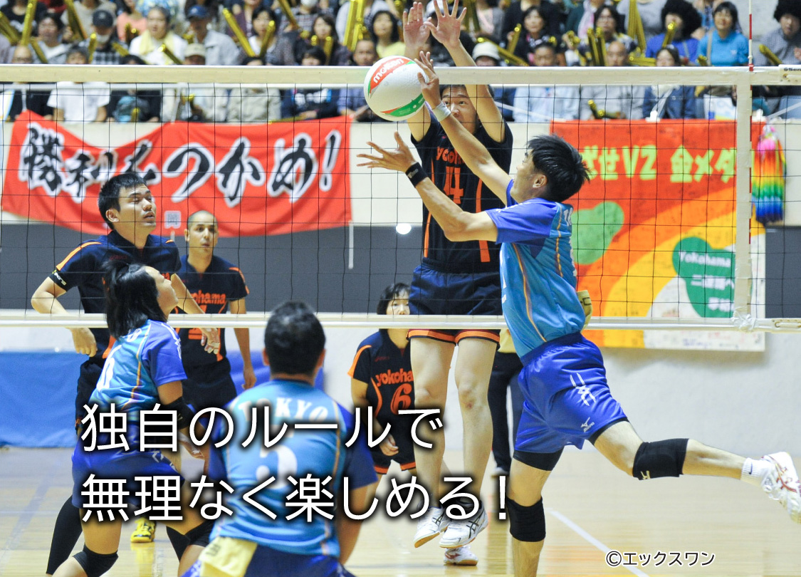 男女混合のチームで、試合には1名以上、女子選手の参加が必要です。一般のバレーのルールと同じですが、ボールはソフトバレーボールを使用し、ネットの高さは2.24mです。ラリーポイント制(サーブ権がどちらにあっても、自チームの攻撃決定時や、相手チームのミス・反則時に得点が入るシステム)で、25点先取すると1セット勝利となり、2セット先取したチームが勝ちです。